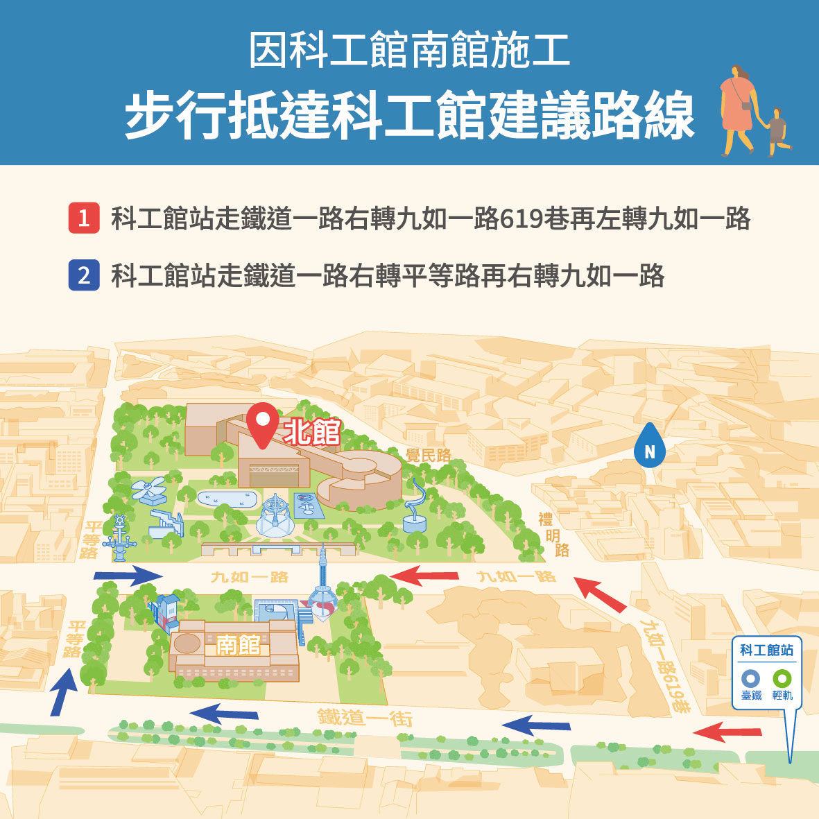 如搭乘火車或輕軌的旅客,前往北館大門的建議路線為: