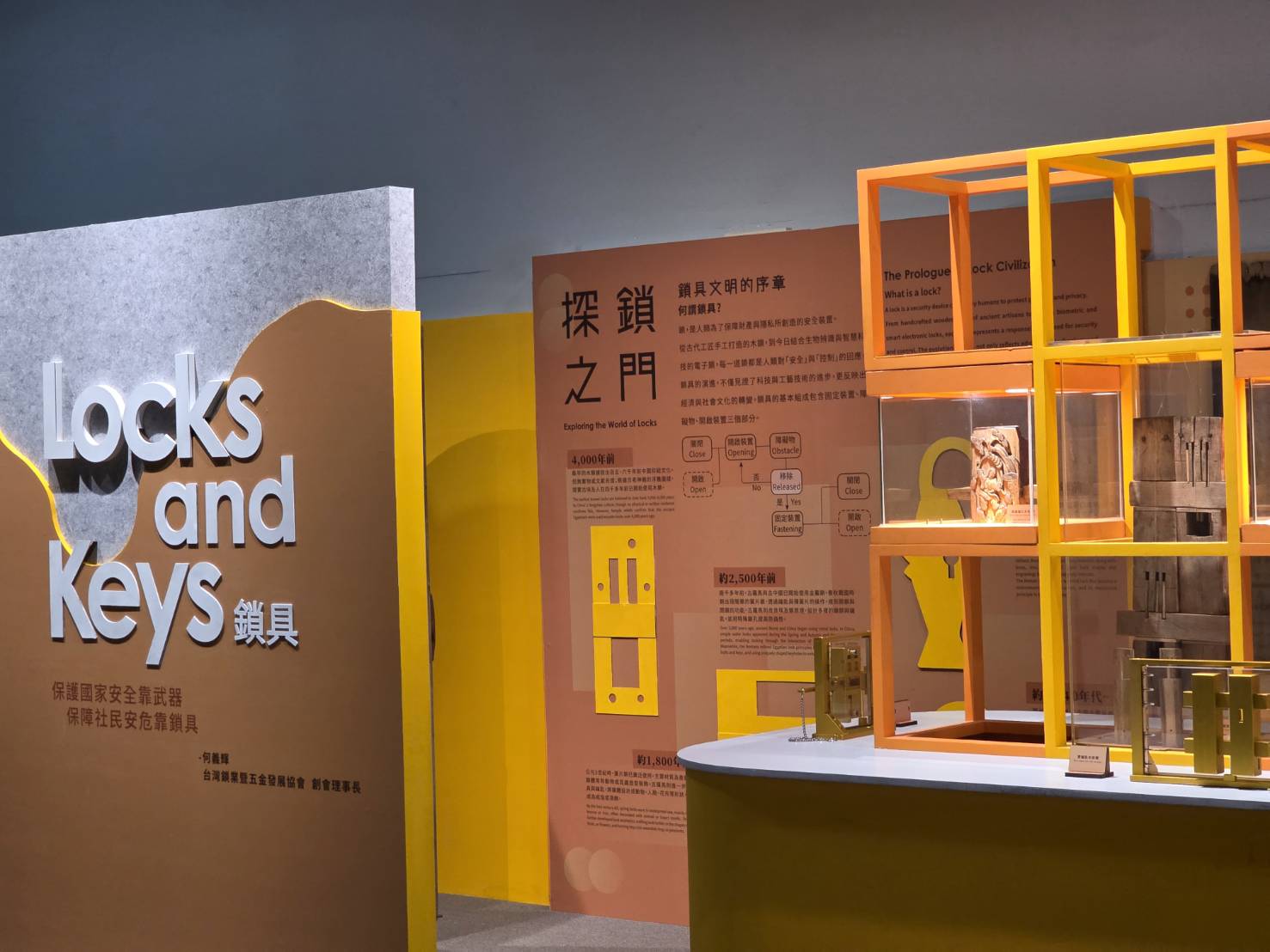 另外還有2F「動力機械廳內之鎖具專區」,則是以「Locks and Keys」為主題、「探鎖機巧與現代守門人,看見安全技術的演進」為旨趣,帶領觀眾從古早時期的早期木栓鎖,一路認識金屬鎖、簧片鎖與現代智慧門鎖的演進。「金屬鎖的巧思與互動」單元,透過剖面模型與透明外殼展示簧片鎖、木栓鎖與組合鎖的作動原理,觀眾可以實際推拉鎖栓、轉動刻有文字或數字的轉輪,觀察簧片、缺口與鎖梗如何配合,體會「對的鑰匙」為何能在對的位置解鎖。牆面上的「鎖具展示牆」則集結廣鎖、花旗鎖、魚形鎖、人形鎖與西洋鎖等各式古今造型,也點出鎖在生活中兼具實用與吉祥意涵。而「鎖匠工坊:製造技術與工藝解密」區,搭配影片與實物機具,呈現開鎖、配鎖與門鎖製造流程;一旁的「現代守門人」、「安全新世代」展台則整合指紋辨識、臉部辨識與智慧門鎖,呈現從機械結構到智慧科技的轉變,讓民眾理解安全防護不僅是硬體,更反映社會對隱私、居家安全與生活品質的期待。從古老的木鎖到現代的精巧機械鎖,每一道鎖的轉動,都是人類智慧的結晶。展區除了呈現鎖具從實用到藝術的演進歷程,更規劃了動手操作解密區,讓觀眾透過解鎖與觀察,理解鎖具中隱藏的奧秘。