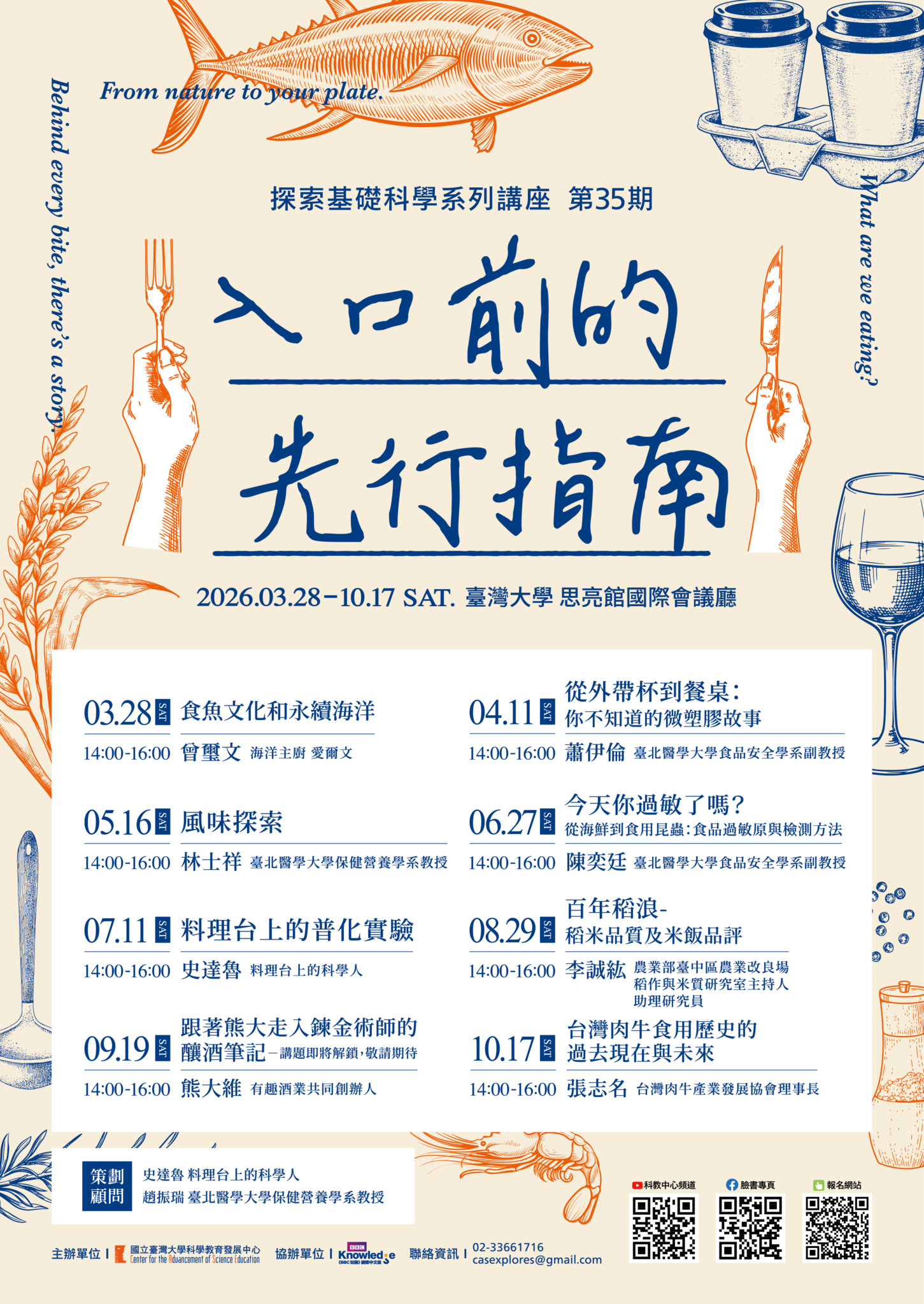 你知道你每天在吃什麼嗎? 這次讓我們化身知識主廚,以【入口前的先行指南】為主題,邀請各領域專家帶你翻開他們的廚房秘笈! 從食安與永續的深度思辨,到風味科學的感官誘惑;從食品加工的魔術,到酒類蒸餾的熟成藝術,甚至你家廚房裡的物理化學實驗。 講座內容將是大口朵頤前的「掃雷與導覽」。